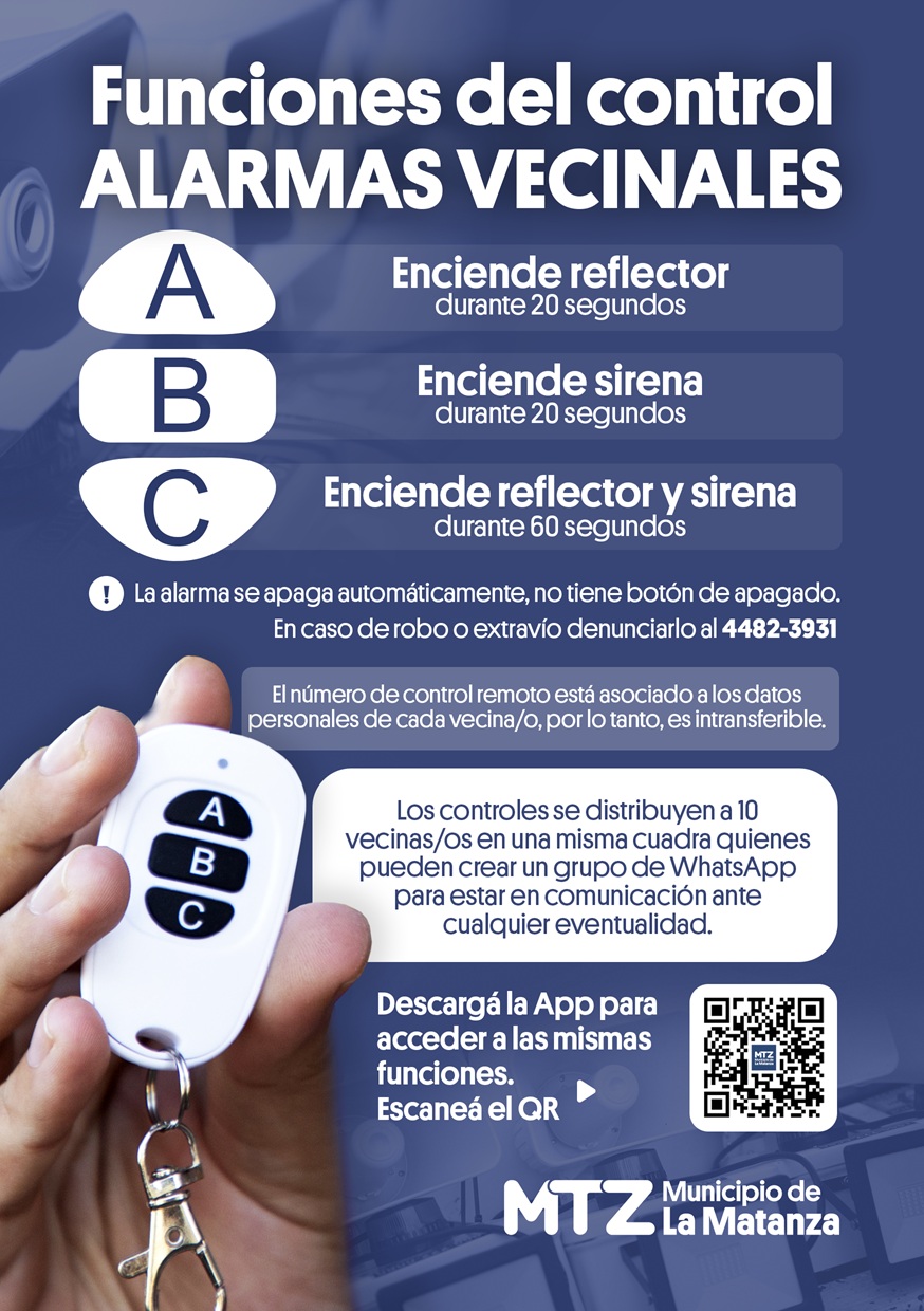 Luego de la instalación, las vecinas y vecinos reciben un control remoto para poder activar la alarma, ante un evento. A su vez, podrán contar también con la opción de descargar una APP en su celular, para el funcionamiento de la alarma.